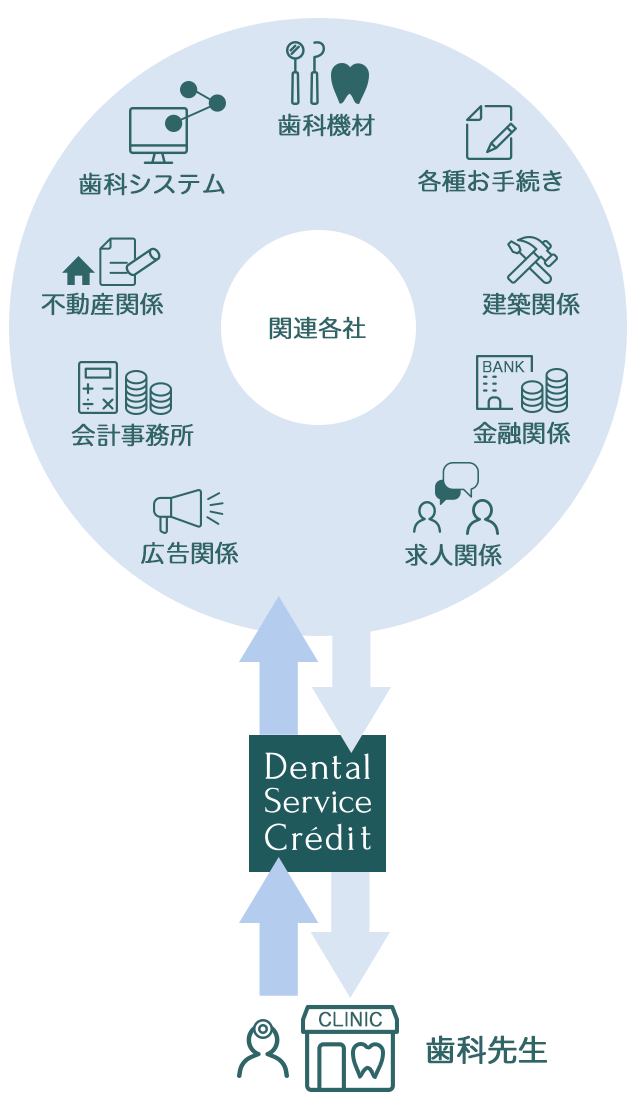 【デンタルサービス クレディ】は、先生方がスムーズに開業・独立・移転できるように、立地場所のご提案、資金繰りを支える金融機関、財務管理をアドバイスする税理士、建築に関わる施工業者の方々と連携してサポートさせていただきます。